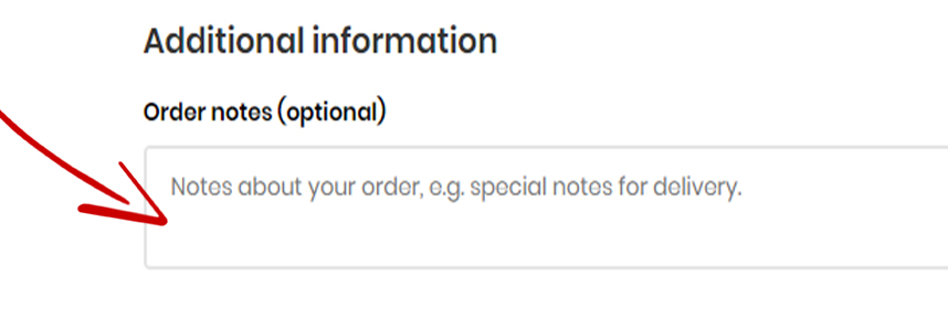 3. Under Order notes (optional), please make a quick description of your order, order number (if you have it), and any other information you want to relay to us. Also please confirm your shipping info here.